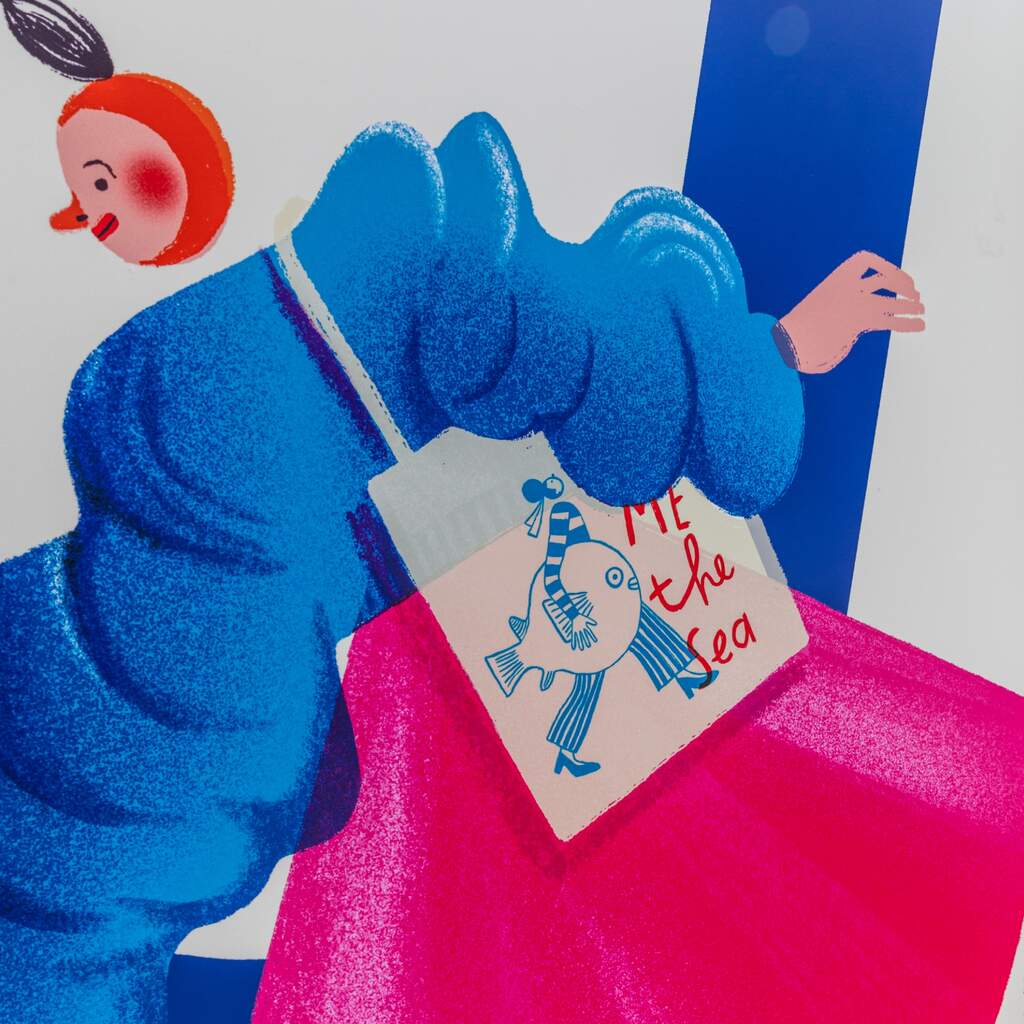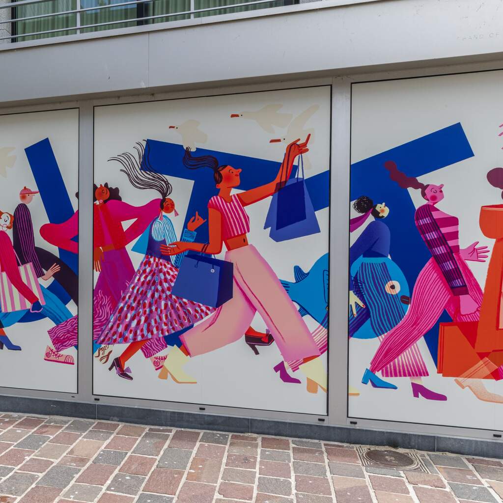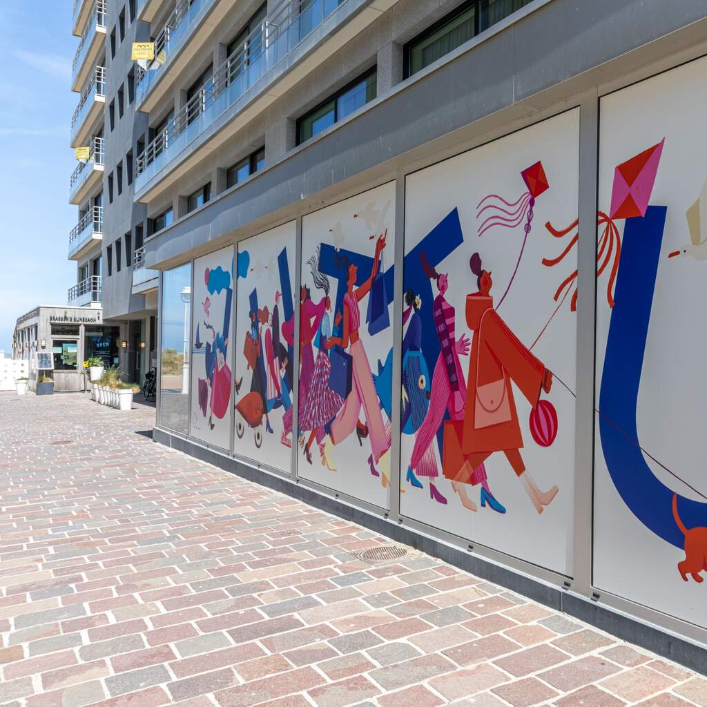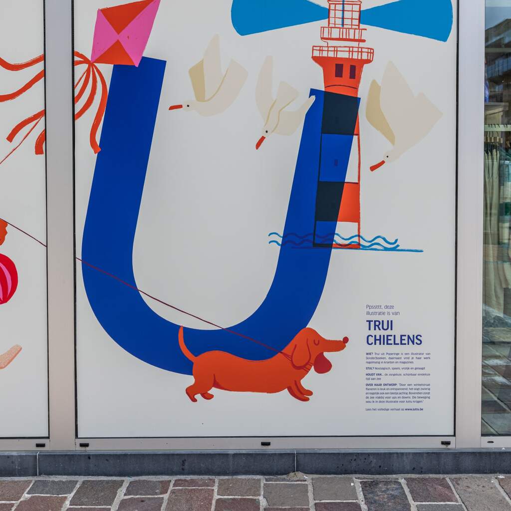 « Flâner dans une rue commerçante, c’est agréable, parfois léger, parfois un peu speed. Et avec la mer juste à côté, l’humeur monte et descend. Je voulais retrouver ce mouvement dans ma composition. J’ai donc imaginé un groupe de personnages exubérants — surtout des femmes, puisque Juttu Nieuwpoort ne propose que des vêtements féminins. Les lettres s’insèrent de façon ludique dans la scène, elles accentuent ce dynamisme. Et puis, j’intègre souvent de la typographie manuscrite dans mes dessins, c’est un peu ma signature. »