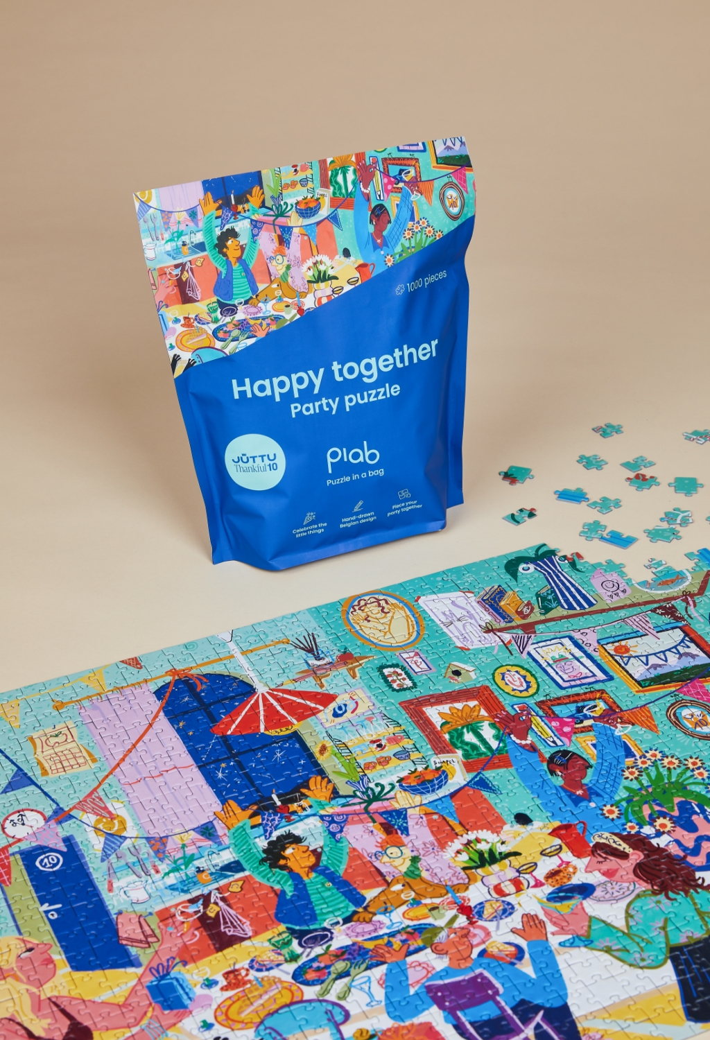 “Juttu is voor mij de plek waar je leuke cadeautjes koopt voor je familie en vrienden. Spontane gezelligheid en samenzijn vond ik erg belangrijk in mijn illustratie. Ook de vele kleuren en het speelse karakter passen bij Juttu. En natuurlijk is het feest nu jullie de tiende verjaardag vieren, dus daar horen taart, cadeaus, vlaggetjes, luide babbels en een beetje chaos bij.”