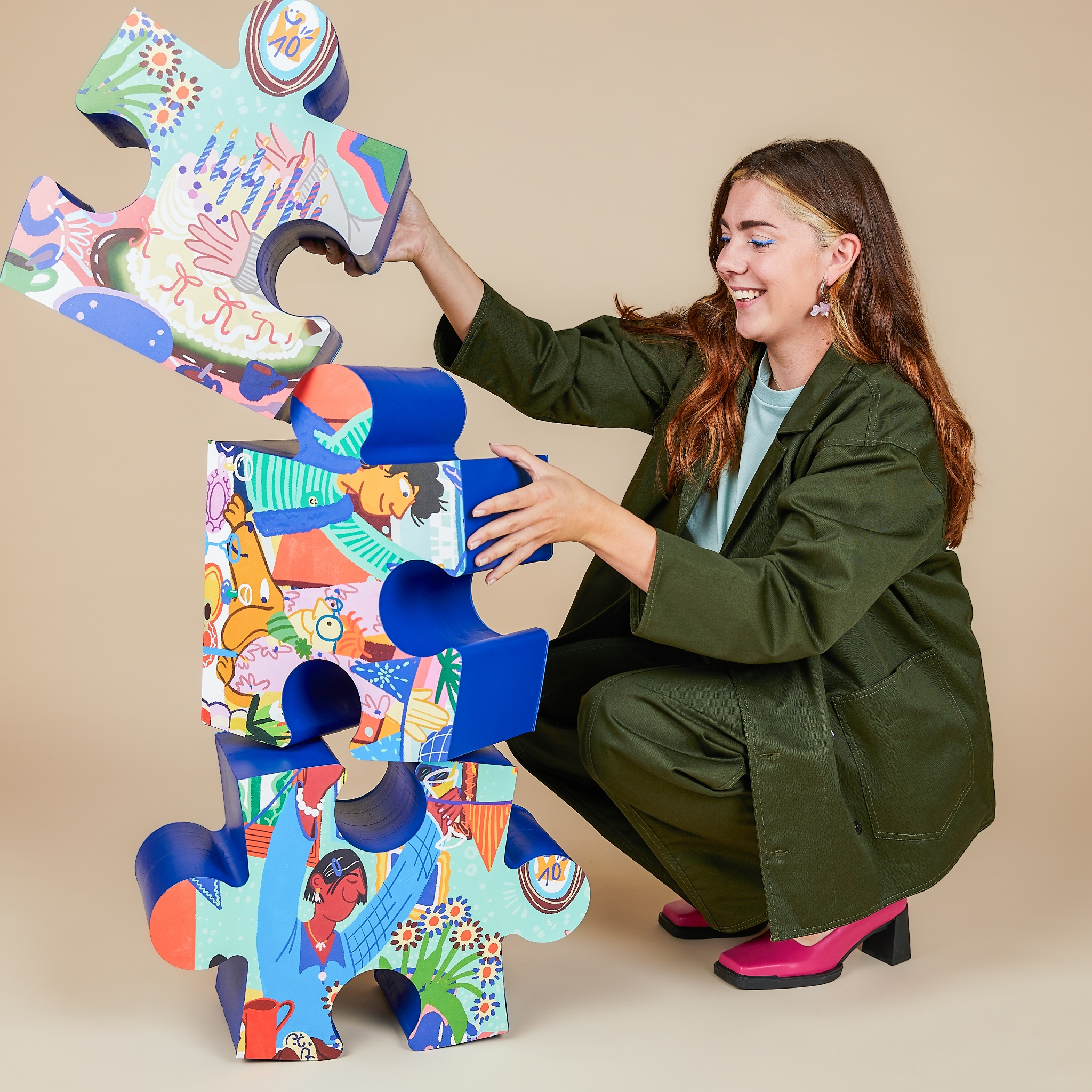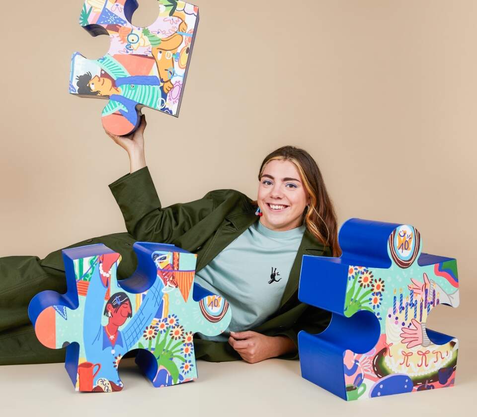 Illustrator Eva Lynen heeft een kleurrijke en speelse stijl. De geknipte persoon dus om voor onze tiende verjaardag een feestje op papier te zetten. Het resultaat is een heerlijk uitbundige illustratie waarop zoveel te ontdekken valt. Een babbel met het talent achter dit vrolijke werk.