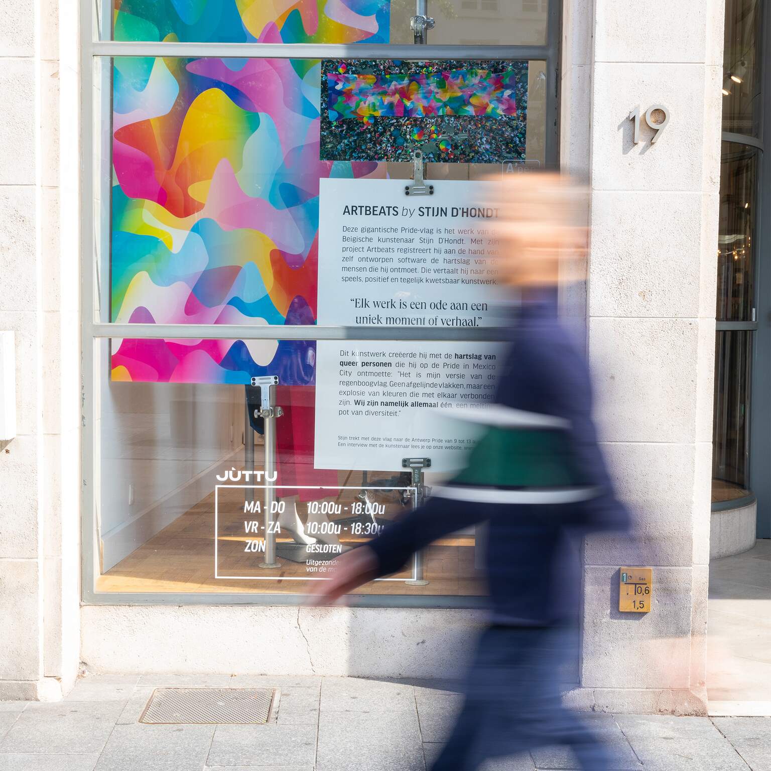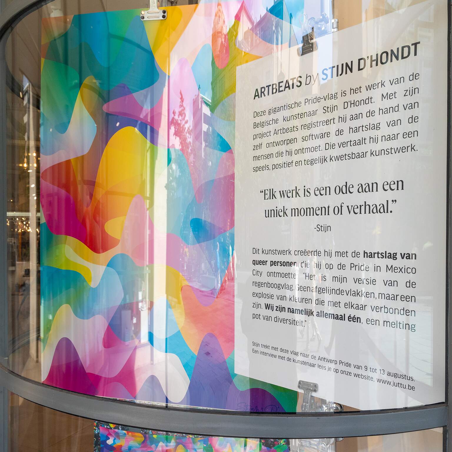 Het is in juni extra kleurrijk in onze etalages, speciaal voor Pride Month maken wij heel graag plaats voor de gigantische Pride-vlag van de Belgische kunstenaar Stijn D’Hondt. Niet alleen een indrukwekkend symbool van diversiteit, ook het verhaal erachter is bijzonder: Stijn registreerde de hartslag van enkele queer personen en vertaalde deze naar een kunstwerk. Een babbel met een hartverwarmende kunstenaar…