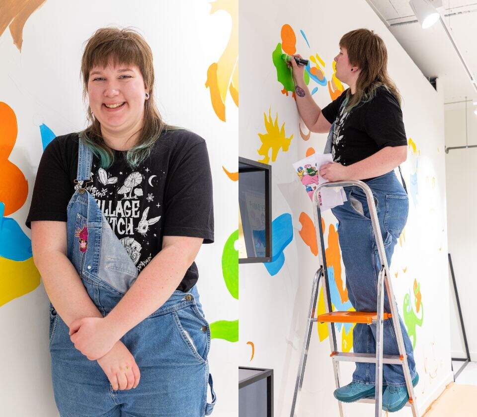 De paskamer van onze nieuwe Juttu store in Aalst kon wel wat kleur gebruiken en dus gingen we op zoek naar een artiest die daarvoor kon zorgen. De jury koos unaniem voor Vaula (33), een Finse die acht jaar geleden naar Aalst verhuisde en die valt voor levendige kleuren, krachtige lijnen én katten.